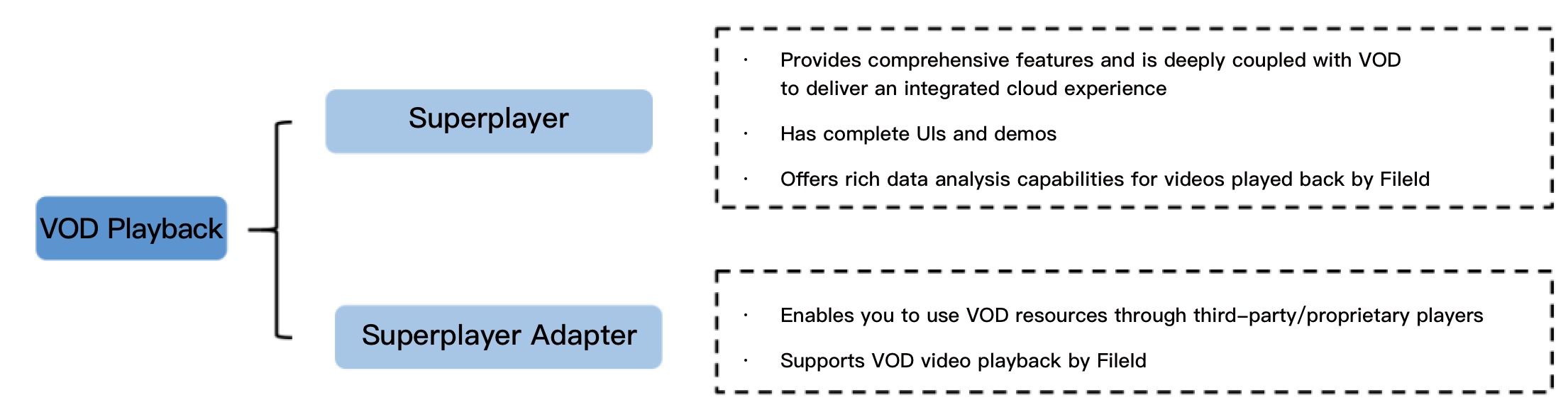 Player: Recommended for users who haven't integrated a player but need to quickly build VOD playback capabilities. Player is fully featured and easy to connect. VOD provides a detailed guide on how to connect it. Player Adapter: Recommended for users who need to play back resources in VOD with a proprietary or third-party player. VOD offers Player Adapter to help you smoothly connect and use resources in VOD.
