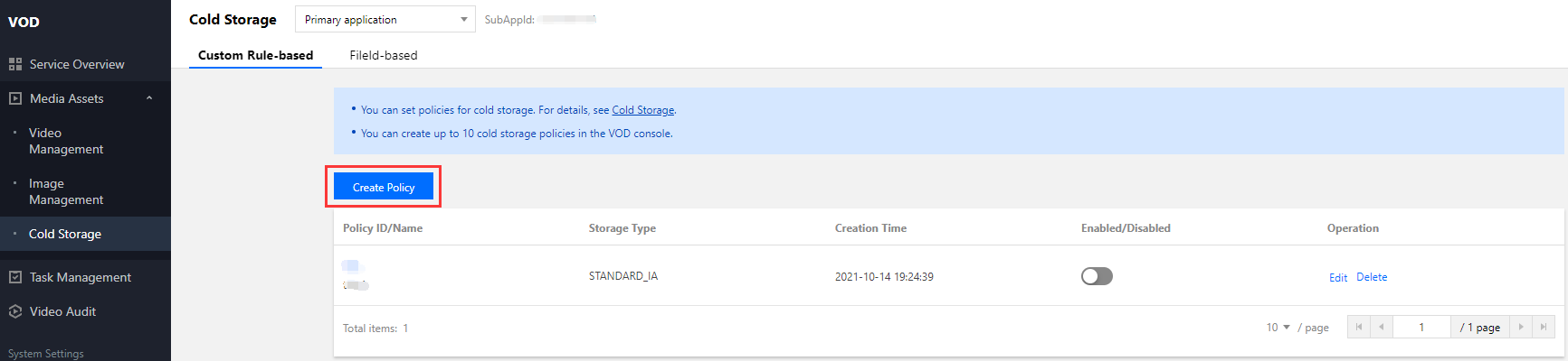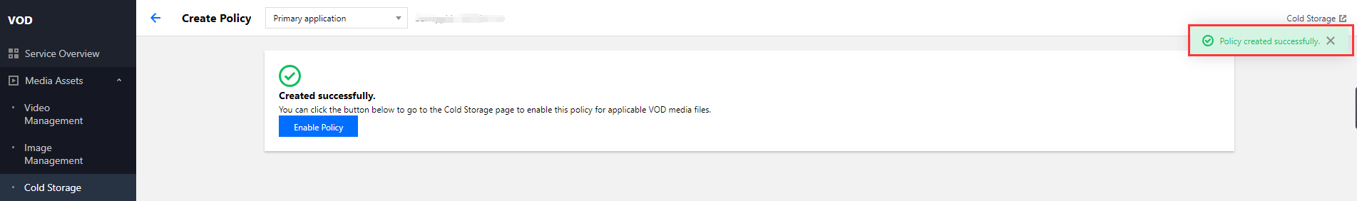 Log in to the VOD console (non-admin), click Media Assets > Cold Storage on the left sidebar, and click Create Policy.
