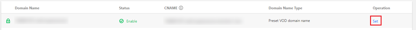 1. Log in to the VOD console, select Distribution and Playback > Domain Name on the left sidebar. Find the default distribution domain, click Set on the right, and select the Access Control tab.