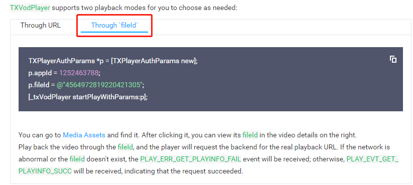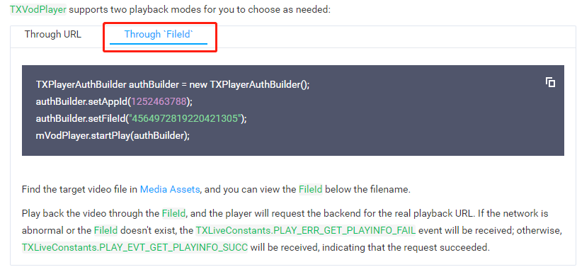 To play the DRM-encrypted video using the VOD player, just pass in the file ID of the video and your VOD account’s AppID when initializing the player.