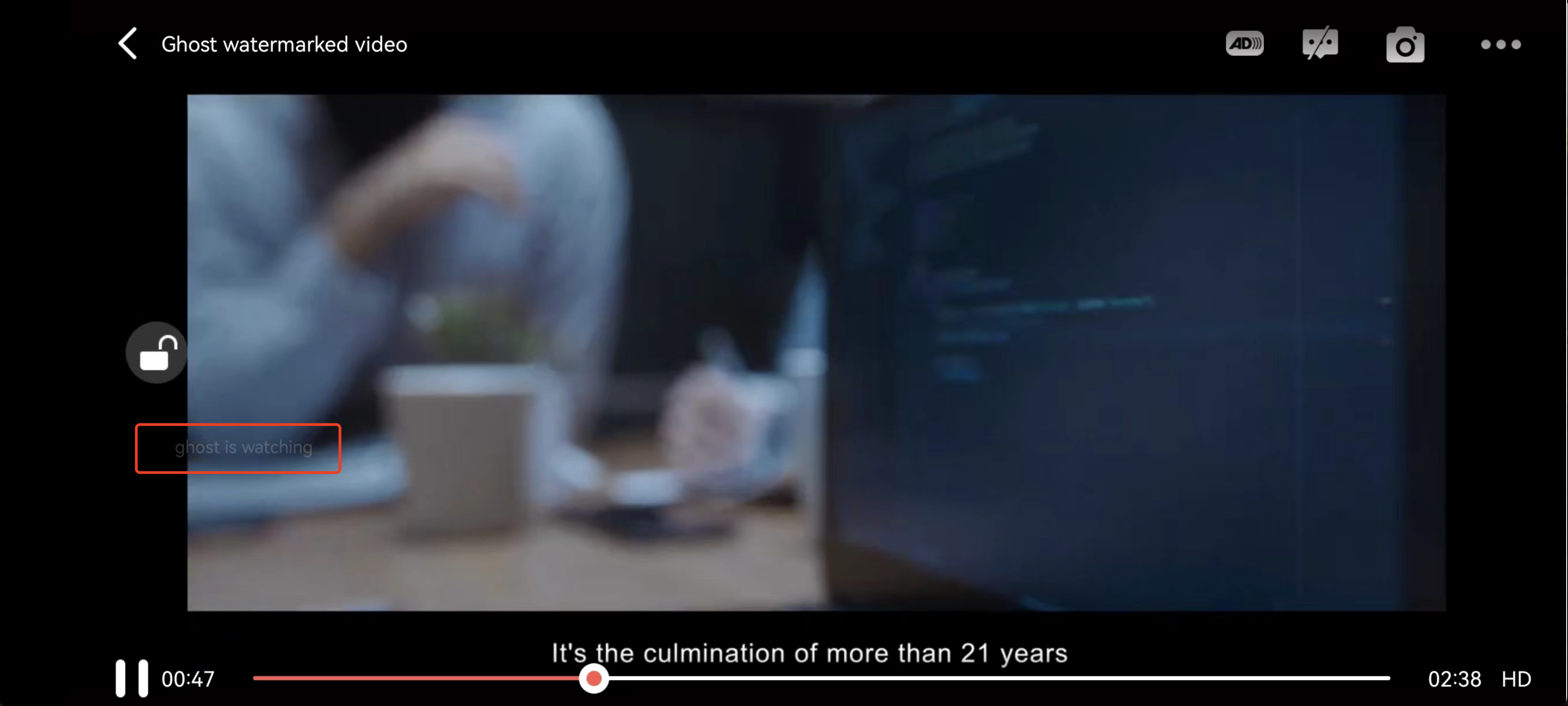 // Step 1: Configure the FileId that supports ghost watermark to play the video.SuperPlayerModel *model = [[SuperPlayerModel alloc] init];model.appId = 1500006438;model.videoId = [[SuperPlayerVideoId alloc] init];model.videoId.fileId = @"387702307847129127";model.videoId.pSign =@"eyJhbGciOiJIUzI1NiIsInR5cCI6IkpXVCJ9.eyJhcHBJZCI6MTUwMDAwNjQzOCwiZmlsZUlkIjoiMzg3NzAyMzA3ODQ3MTI5MTI3IiwiY29udGVudEluZm8iOnsiYXVkaW9WaWRlb1R5cGUiOiJSYXdBZGFwdGl2ZSIsInJhd0FkYXB0aXZlRGVmaW5pdGlvbiI6MTB9LCJjdXJyZW50VGltZVN0YW1wIjoxNjg2ODgzMzYwLCJnaG9zdFdhdGVybWFya0luZm8iOnsidGV4dCI6Imdob3N0IGlzIHdhdGNoaW5nIn19.0G2o4P5xVZ7zFlFUgBLntfX03iGxK9ntD_AONClUUno";[_playerView playWithModelNeedLicence:model];// Step 2: After SuperPlayerView receives the PLAY_EVT_GET_PLAYINFO_SUCC event, obtain the content of the ghost watermark for display.- (void)onPlayEvent:(TXVodPlayer *)player event:(int)EvtID withParam:(NSDictionary *)param {dispatch_async(dispatch_get_main_queue(), ^{if (EvtID == PLAY_EVT_PLAY_EVT_GET_PLAYINFO_SUCCPLAY_PROGRESS) {NSString *ghostWaterText = [param objectForKey:@"EVT_KEY_WATER_MARK_TEXT"];if (ghostWaterText && ghostWaterText.length > 0) {DynamicWaterModel *model = [[DynamicWaterModel alloc] init];model.showType = ghost;model.duration = self.playerModel.duration;model.dynamicWatermarkTip = ghostWaterText;model.textFont = 30;model.textColor = [UIColor redColor];if (![self.subviews containsObject:self.watermarkView]) {[self addSubview:self.watermarkView];[self.watermarkView mas_makeConstraints:^(MASConstraintMaker *make) {make.edges.equalTo(self);}];}[self.watermarkView setDynamicWaterModel:model];}}};}