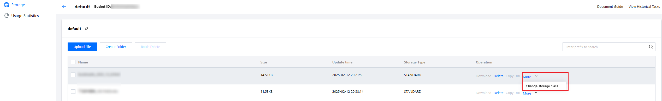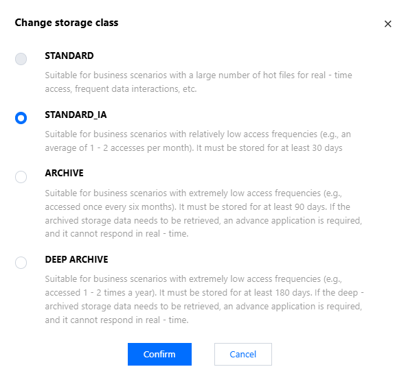 Cooldown for files: If you need to change the file from STANDARD or STANDARD_IA storage to ARCHIVE or DEEP_ARCHIVE storage classes, you can click More > Change storage class in turn, select the target storage type in the modification pop-up, and click Confirm to complete the operation.