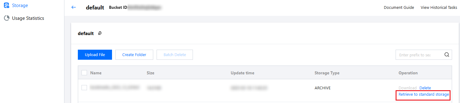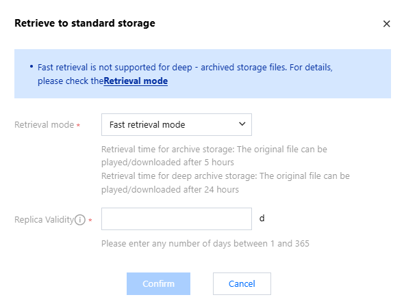 Temporary retrieval of files: If you need to temporarily retrieve ARCHIVE or DEEP_ARCHIVE storage, you can click Retrieve to Standard Storage, and select the valid period and mode of retrieval in the retrieval pop-up.