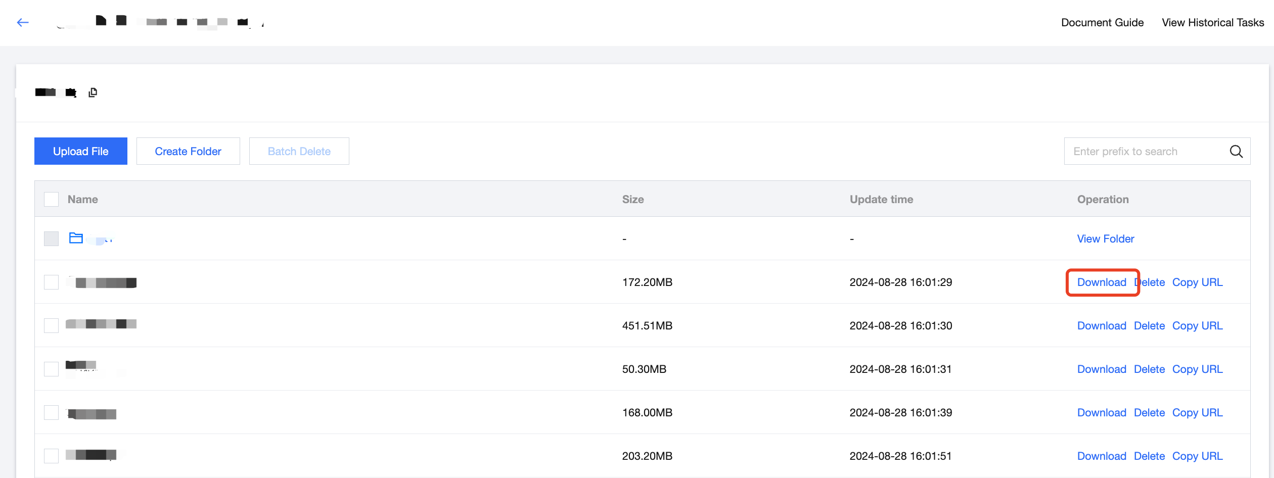4. On the bucket's file list page, find the file you need to download and click Download in the actions.