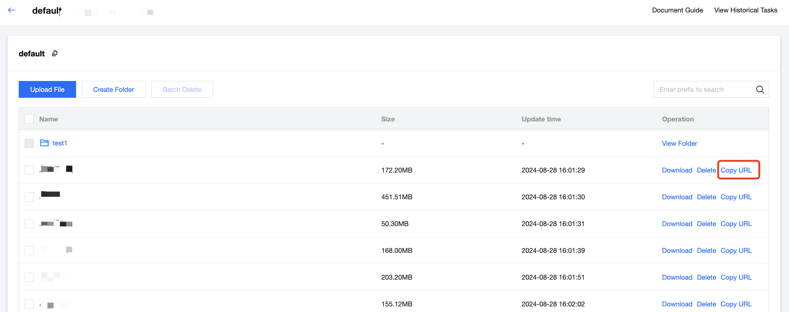 4. On the file list page of the bucket, find the file to share, click Copy URL in the actions to copy and share the file with other users.
