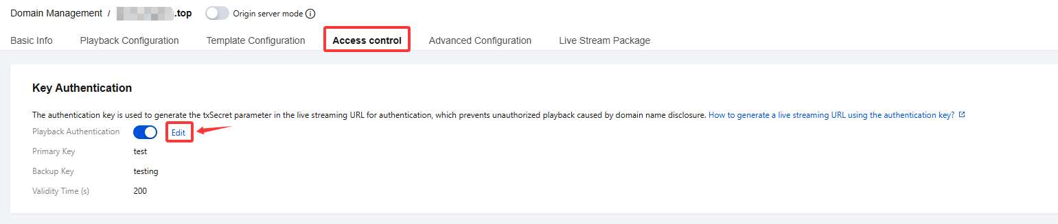 1. Select Domain Management, and click the playback domain name that requires authentication configuration or click Manage to enter the domain name management page. 2. In the Access control > Key Authentication section, click Edit to enter the key authentication configuration page.