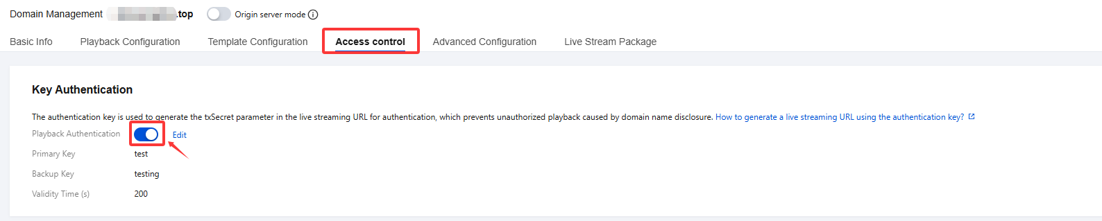 1. Select Domain Management and click the playback domain name for which you want to enable authentication or click Manage to enter the domain name management page. 2. In the Access control > Key Authentication section, click to enable key authentication. 3. Complete the following settings on the authentication configuration page: