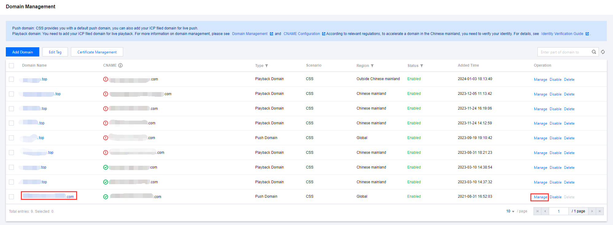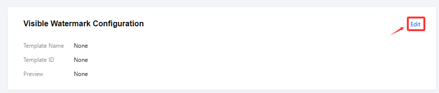 1. Go to Domain Management and click the push domain name to be configured or Manage to enter the domain name details page. 2. Select Template Configuration and click Edit in the Visible Watermark Configuration section.