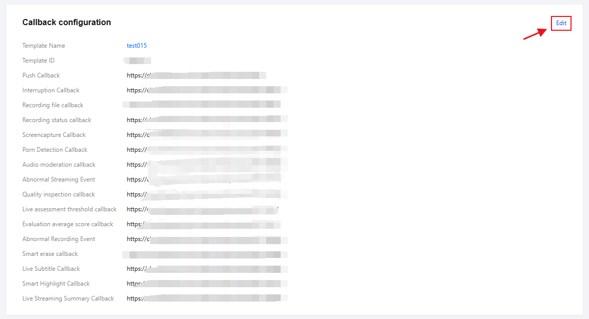 1. Go to Domain Management, and click the target push domain name or Manage to enter the domain details page. 2. Select Template Configuration and click Edit in the upper right corner of the Callback Configuration tab.