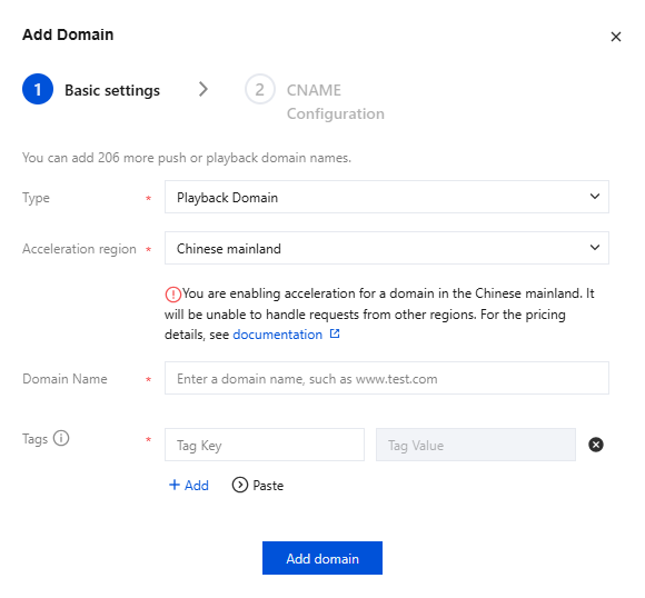 In the process of adding a new domain and selecting a playback domain, please choose the acceleration region required for live broadcast distribution, such as "Chinese mainland". Subsequently, fill in the domain name and tag information optionally. Click on Add Domain and proceed to the next step.