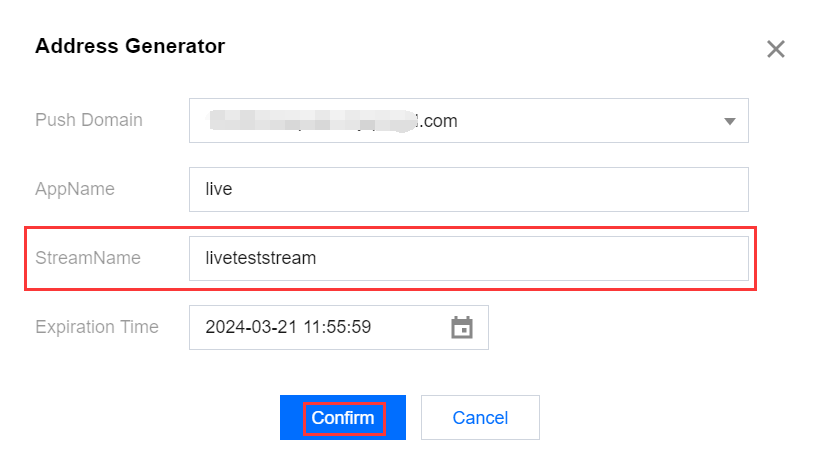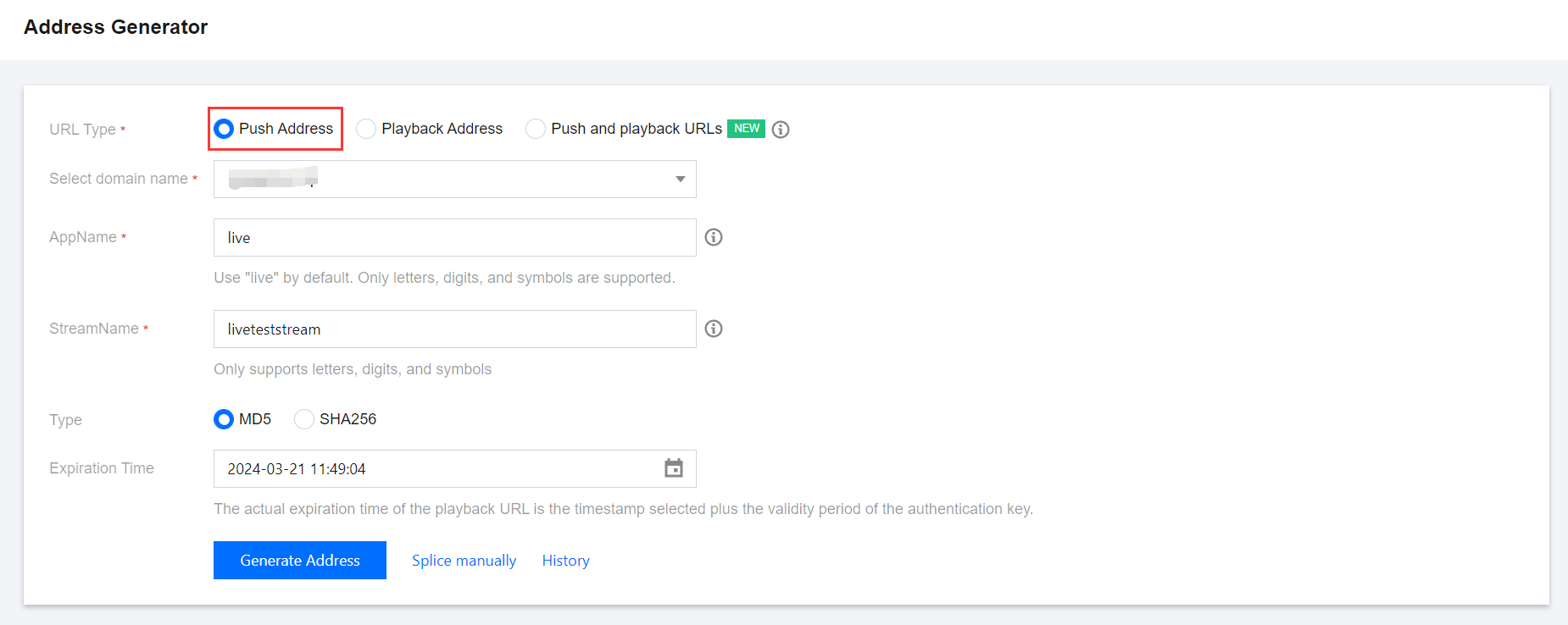 rtmp://domain/AppName/StreamName?txSecret=Md5(key+StreamName+hex(time))&txTime=hex(time) In addition to the above method, you can also select a push domain name in Domain Management in the CSS console, click Manage, select Push Configuration, enter the expiration time of the push address and the custom StreamName, and click Generate Push Address to generate a push address.