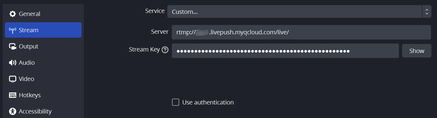 3.2 Enter the first half of the push address as the server, such as rtmp://xxxx.livepush.myqcloud.com/live/.