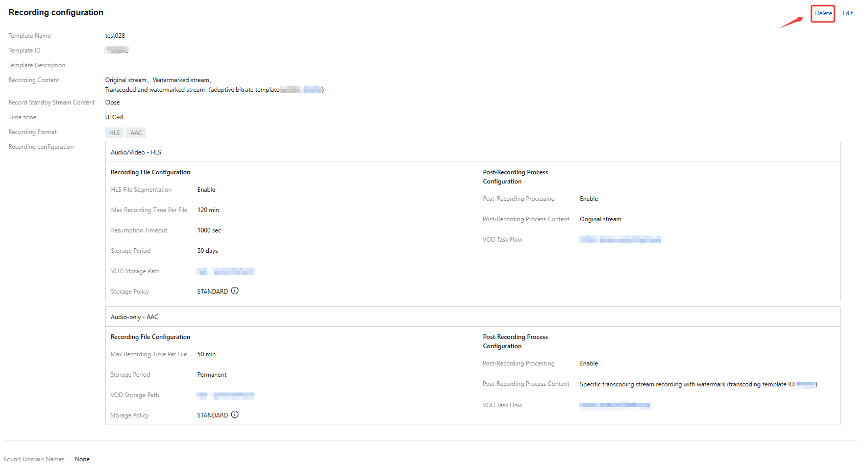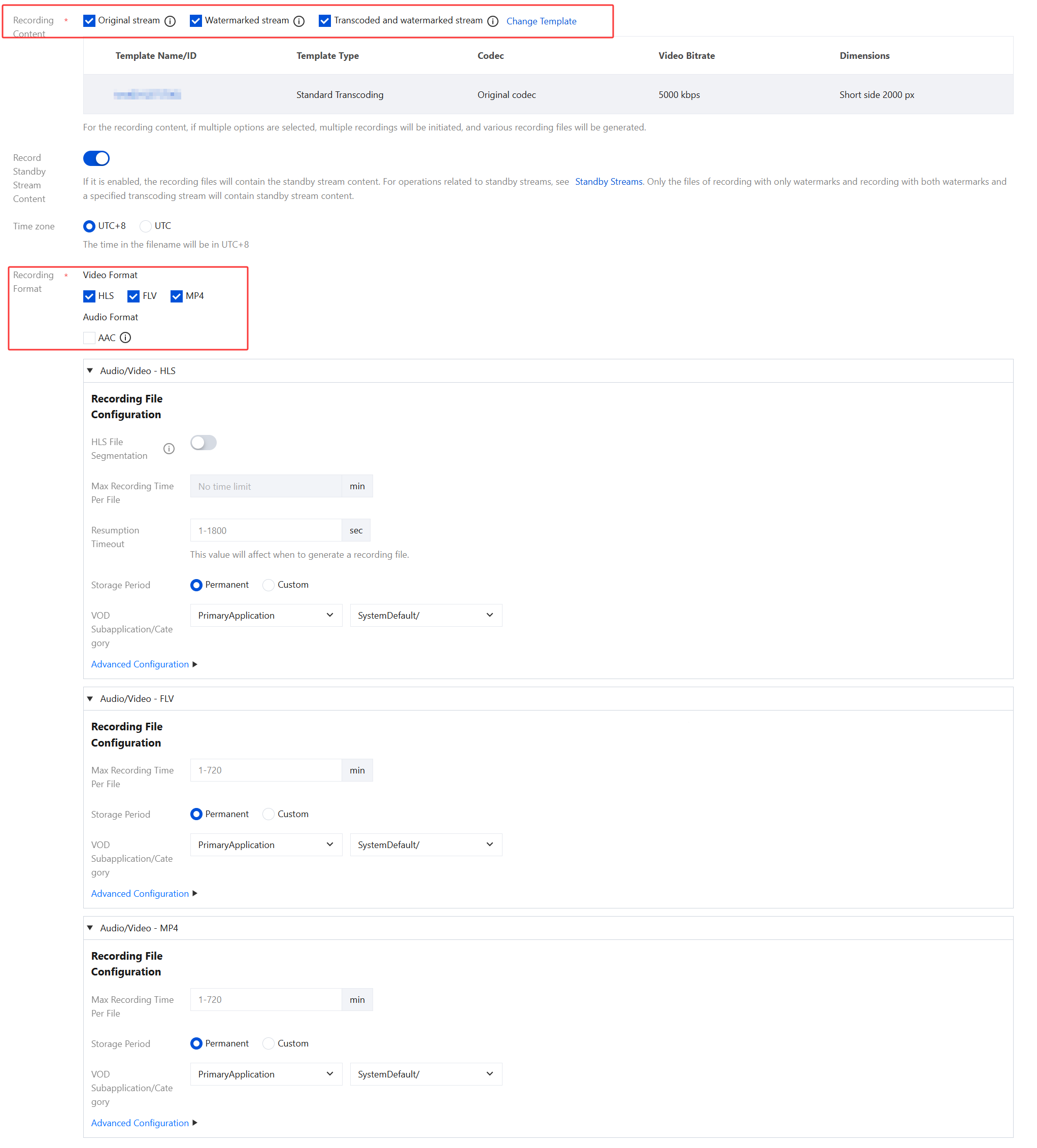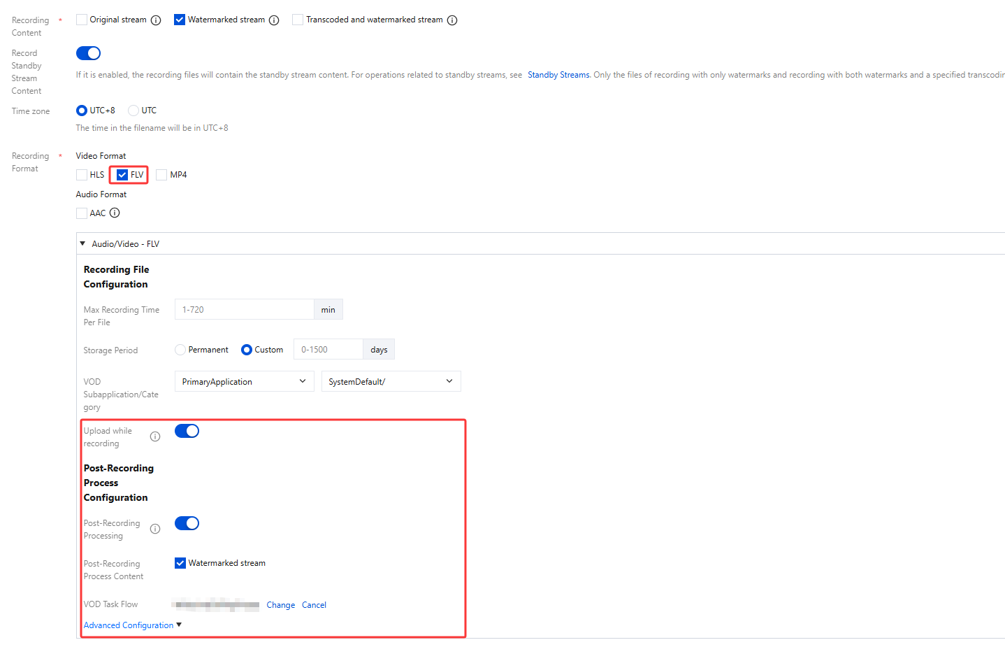Post-Recording Process Configuration | The post-recording processing feature is disabled by default. You can manually enable this feature based on your business needs. After enabling post-recording processing, no post-recording process content is selected by default. You need to manually select the corresponding process content. When HLS, FLV, MP4, and AAC audio and video formats are enabled with post-recording processing, the on-demand task flow cannot be empty. You can cancel or change the VOD task flow . You can click to select the bound task flow and choose a task flow already created under the VOD application, or click the task flow name on the current VOD task flow selection page to go to the VOD console to add/modify the task flow configuration. After the task flow is successfully bound, the VOD task flow template will be executed after the recording file is generated, incurring corresponding video on demand fees. |