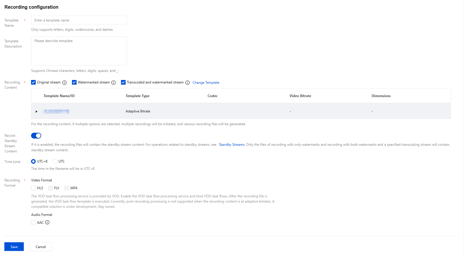 | Transcoded and watermarked stream | Click Transcoded and watermarked stream. You can select an existing transcoding template or click the name of a template to modify its configuration. Videos will be recorded after they are transcoded according to the specified transcoding template. If the template is deleted, the settings for recording watermarked streams will apply. |