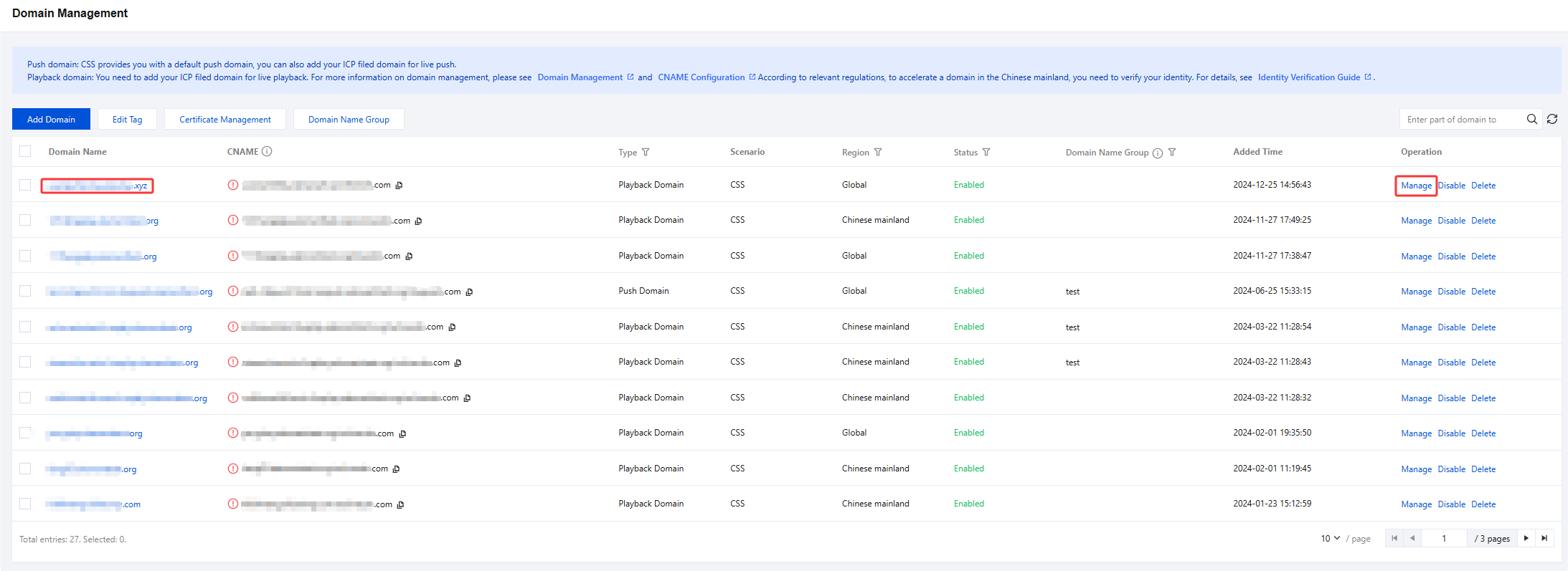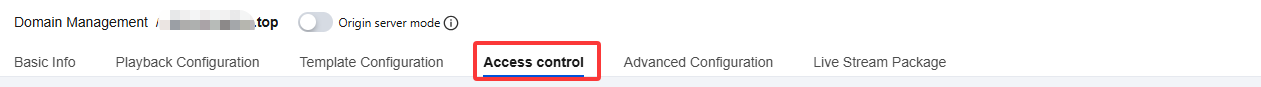 1. Select Domain Management, and click the target playback domain or click Manage on the right to enter the domain management page. 2. In Access Control > Referer Configuration, click to disable the referer.