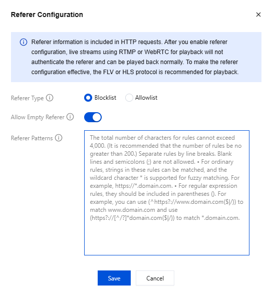 Referer Type | Select Blocklist or Allowlist as the referer type. You cannot select both of them, When the referer allowlist is configured, request sources on the list will be allowed to access the live streaming content while those not on the list will be blocked. When the referer blocklist is configured, request sources on the list will be blocked to access the live streaming content while those not on the list will be allowed. |