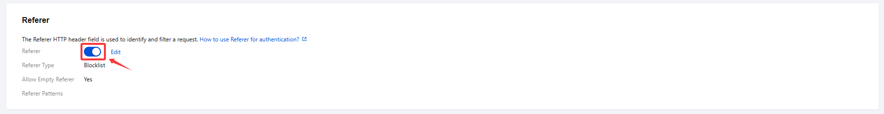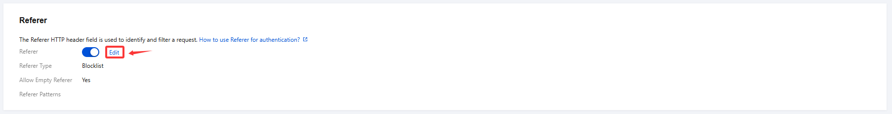 Referer Patterns | The total number of characters for rules cannot exceed 4,000. (It is recommended that the number of rules be no greater than 200.) Separate rules by line breaks. Blank lines and semicolons (;)are not allowed. For ordinary rules, strings in these rules can be matched, and the wildcard character * is supported for fuzzy matching. For example,https://*.domain.com. For regular expression rules, they should be included in parentheses(). For example, you can use (^https?://www.domain.com($/) to match www.domain.com and use (https?://[^/?]*domain.com($|/) to match*.domain.com. |