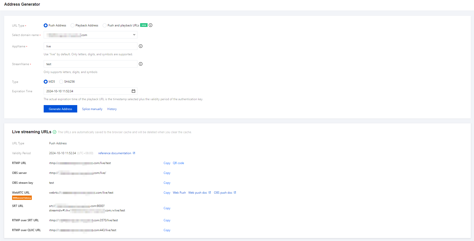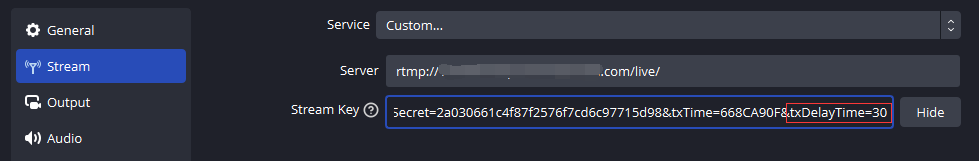 1. Log in to the CSS console, go to Tools > Address Generator, select Push Domain for Domain Type, and click Generate Address. 2. Add txDelayTime to the end of the push address, and push streams via OBS. For detailed directions, please see Push via OBS. Note:
