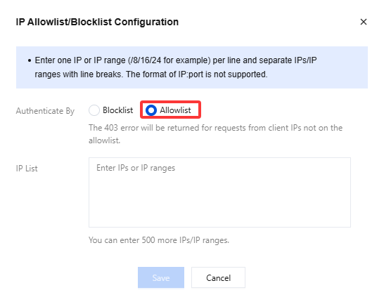 IP List | The IP blocklist supports a maximum configuration of 200 rules, and the IP allowlist supports up to 500 rules. Please separate entries with a newline character. You can enter IP addresses or IP ranges (/8/16/24). The “IP address: port number” format is not supported. IPv6 is not supported currently. |