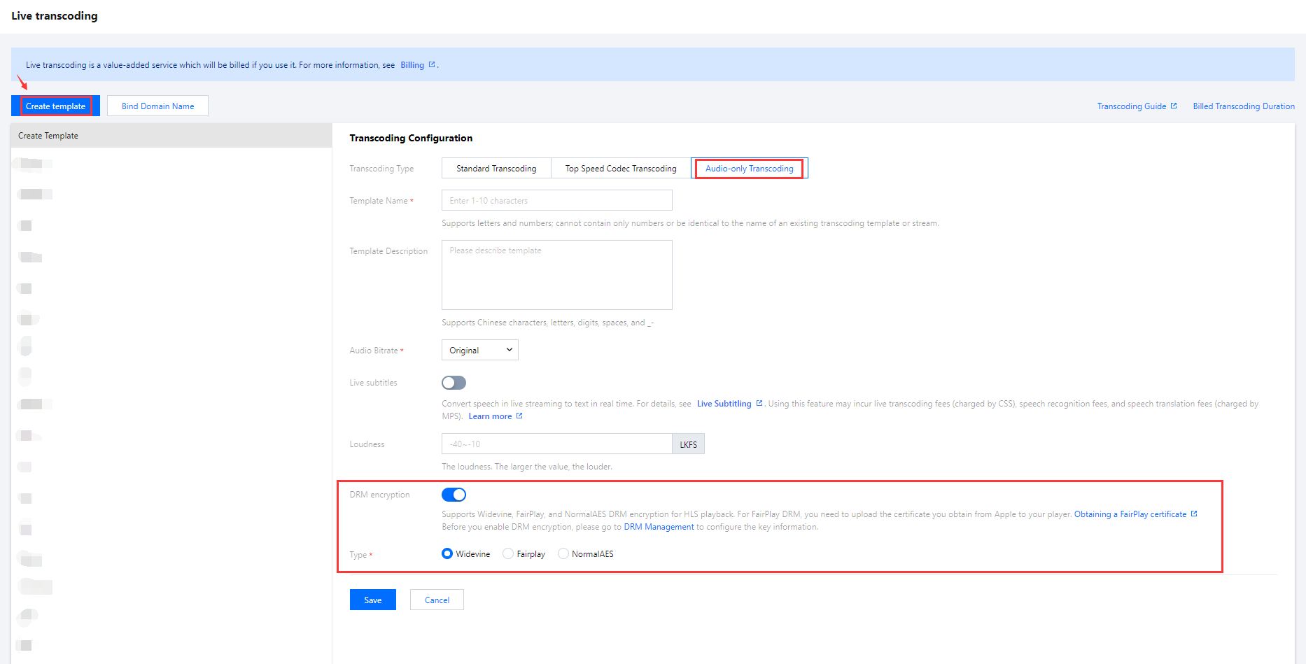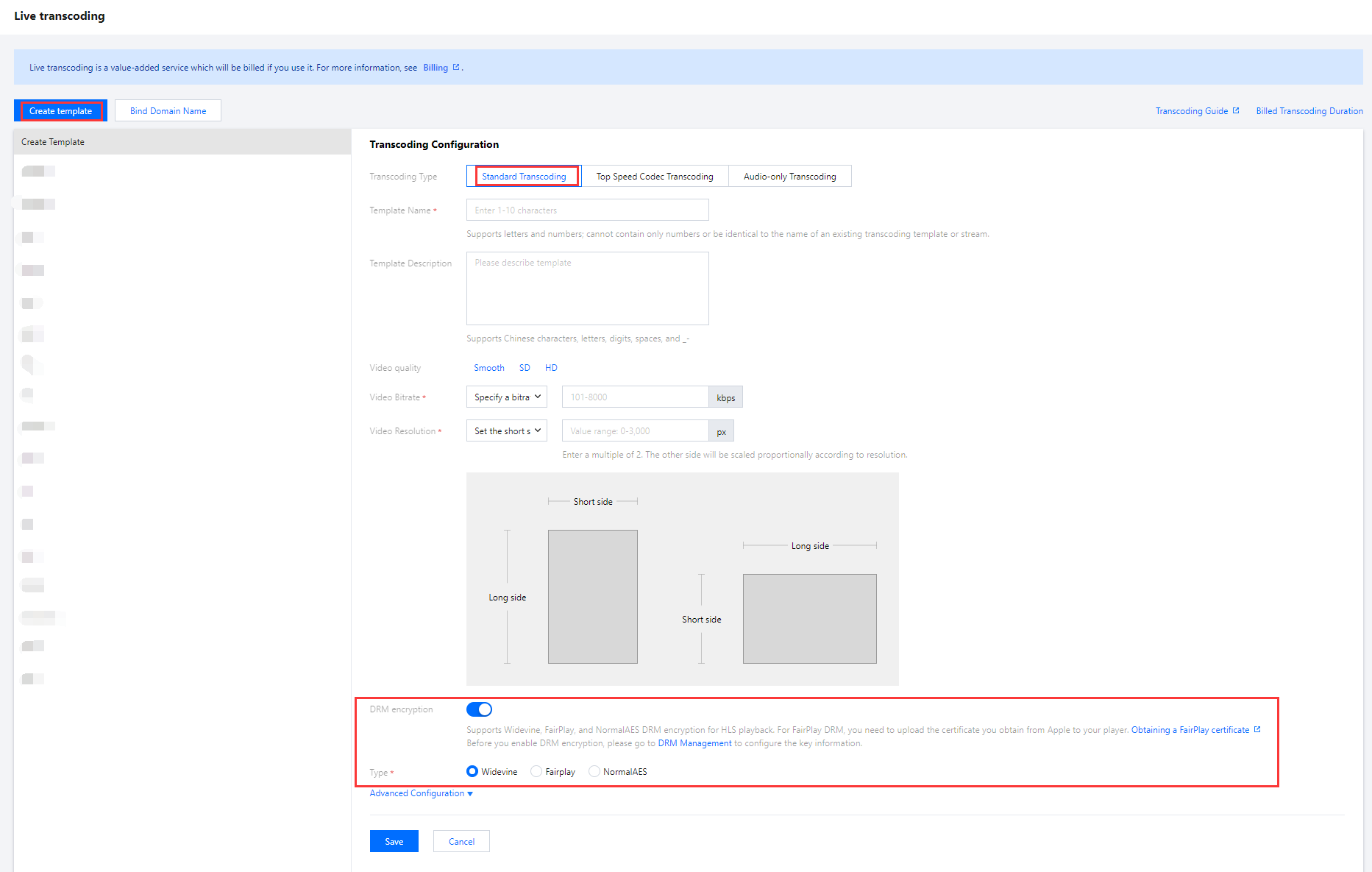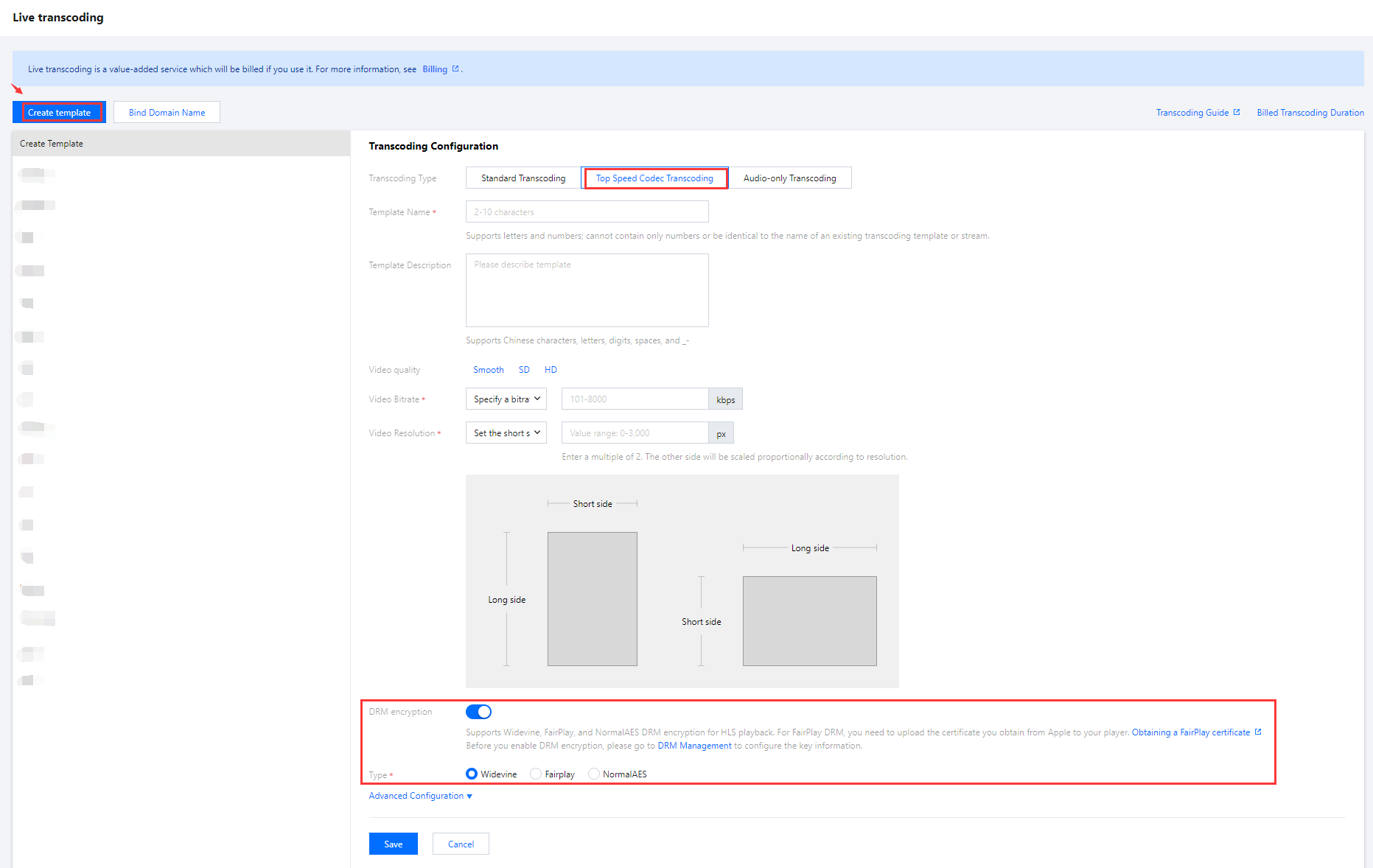 1. Log in to the CSS console and enter the Feature Configuration > Live Transcoding. 2. Click Create Transcoding Template to enter the transcoding configuration page. Click to enable the DRM encryption. Set the DRM encryption information. |