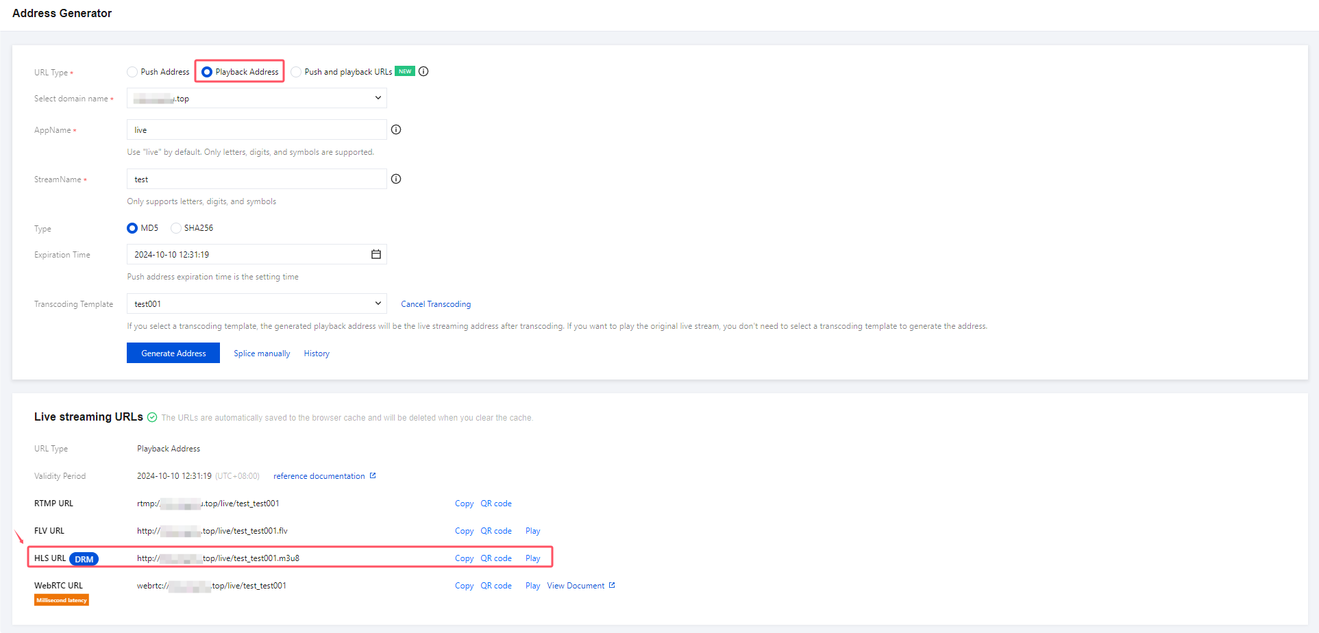 Only HLS playback supports DRM encryption. Use the Address Generator to generate playback URLs (select the template you created). The HLS URL generated is DRM-encrypted. Configuring Your Player