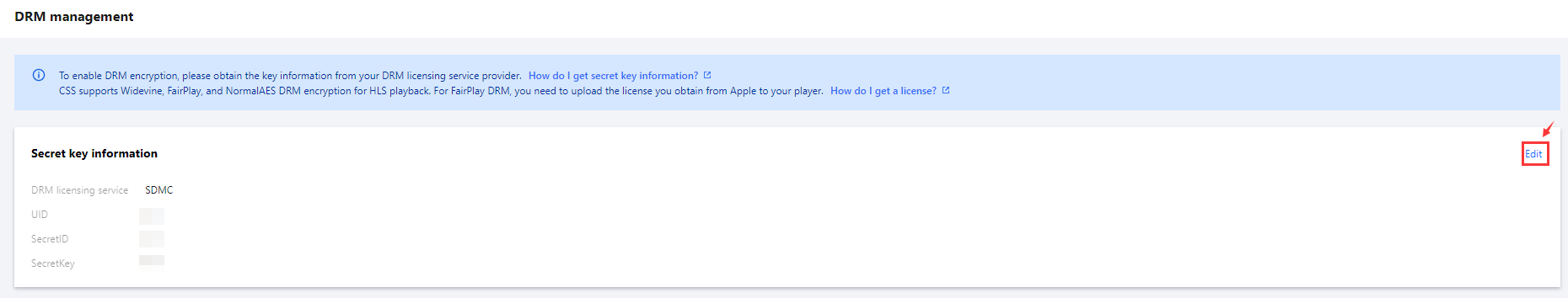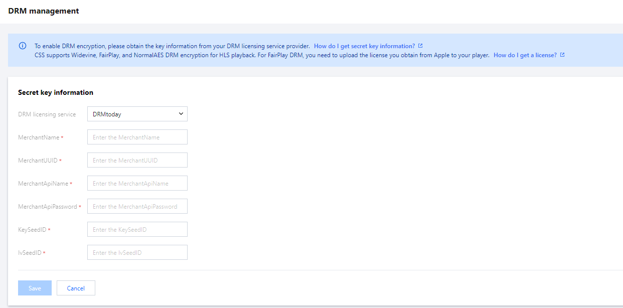 CSS offers DRM encryption capabilities based on Widevine, FairPlay, and NormalAES to help you protect your content and prevent piracy and hotlinking. This document shows you how to configure DRM encryption in the CSS console.