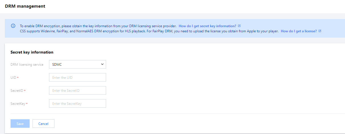 3. Fill in the secret key information and select your certificate management provider. You can choose SDMC or DRMtoday. The specific configuration is as follows: