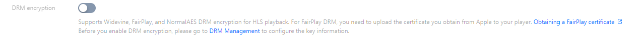 DRM encryption | No | Whether to enable DRM encryption. It’s disabled by default. Before enabling this feature, you need to configure DRM key information in “DRM management”. |