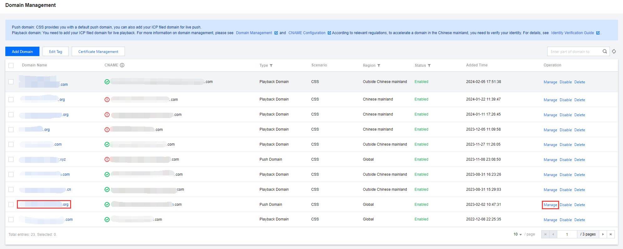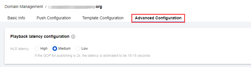 1. Select Domain Management on the left sidebar and click the target push domain or click Manage on the right to enter the details page. 2. In Advanced Configuration > Playback latency configuration , you can configure the latency for HLS.