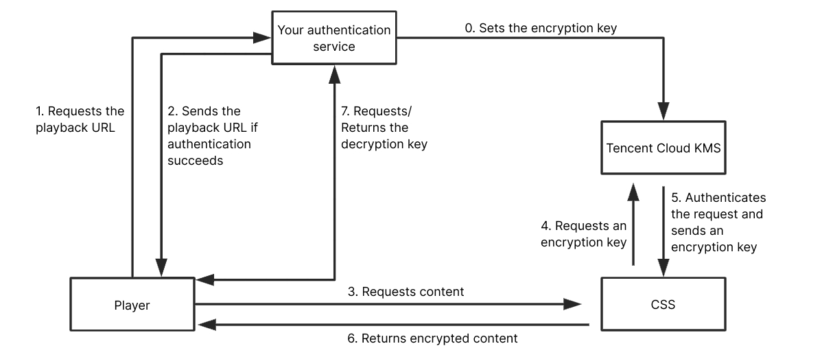 How it works: You set an encryption key. CSS uses the key to encrypt your streams. When a viewer requests to play your streams, you authenticate the request and distribute a decryption key to the client. This process is similar to the AES-128 encryption/decryption process.