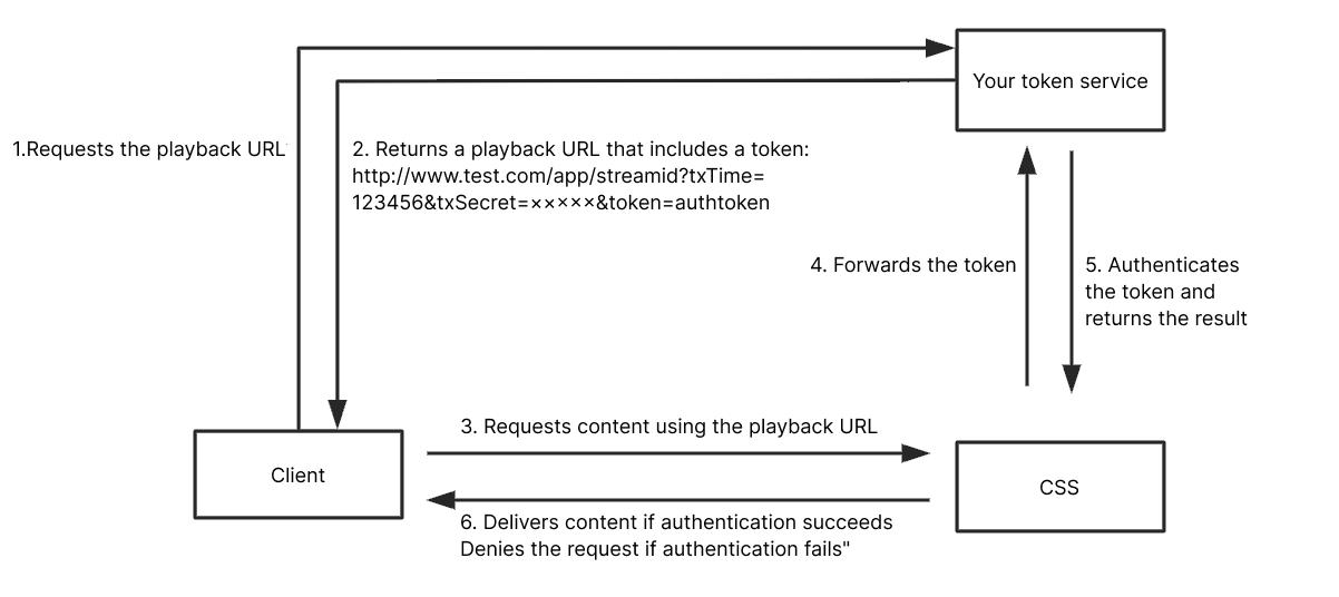 How it works: After authenticating txSecret, Tencent Cloud will call a server API to forward the playback request to your token service. Your token service will authenticate the token in the request and return the result to Tencent Cloud. This allows you to determine whether to allow a playback request.