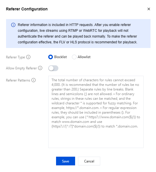 Hotlink protection | Without hotlink protection, anyone can use your playback URL. Many playback URLs use similar formats, for example, Protocol:\\\\Playback domain\\AppName\\Stream ID. If others figure out your URL format, they may splice playback URLs to play all your streams. This exposes your content, and you have to pay for the traffic consumed by unauthorized playback. |