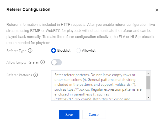 Hotlink protection | Without hotlink protection, anyone can use your playback URL. Many playback URLs use similar formats, for example, Protocol:\\\\Playback domain\\AppName\\Stream ID. If others figure out your URL format, they may splice playback URLs to play all your streams. This exposes your content, and you have to pay for the traffic consumed by unauthorized playback. |