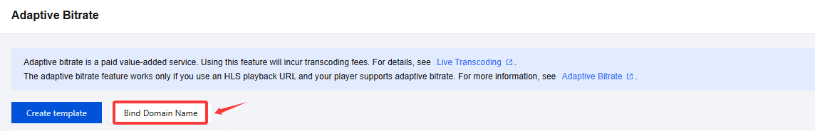 Template name | Yes | Please enter 1 to 10 characters. The adaptive bitrate template name. It only supports letters and alphanumeric combinations and does not support pure digits. The template name must not duplicate existing transcoding template names, adaptive bitrate template names, or sub-stream names. |