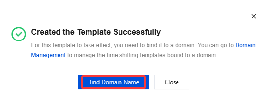 Bind a domain after creating a template: After creating a template, click Bind Domain Name in the dialog box that pops up. 2. In the pop-up window, select a time shifting template and a push domain name(Multiple push domain names can be bound simultaneously) and then click Confirm.
