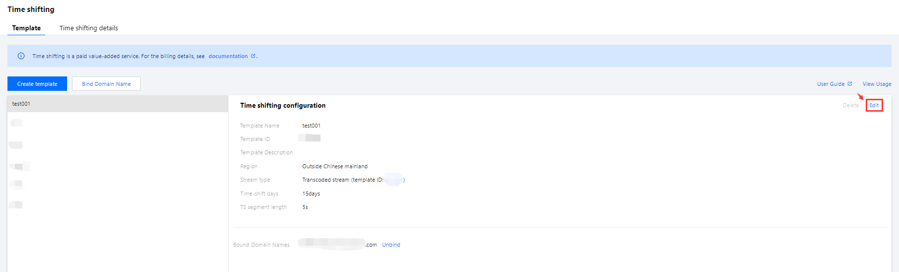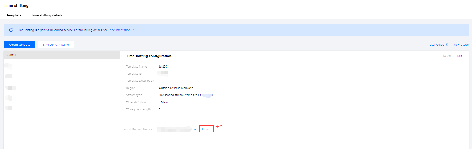 You can also unbind and bind domains and time shifting templates on the Domain Management page. For details, see Time Shifting Configuration.