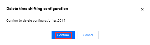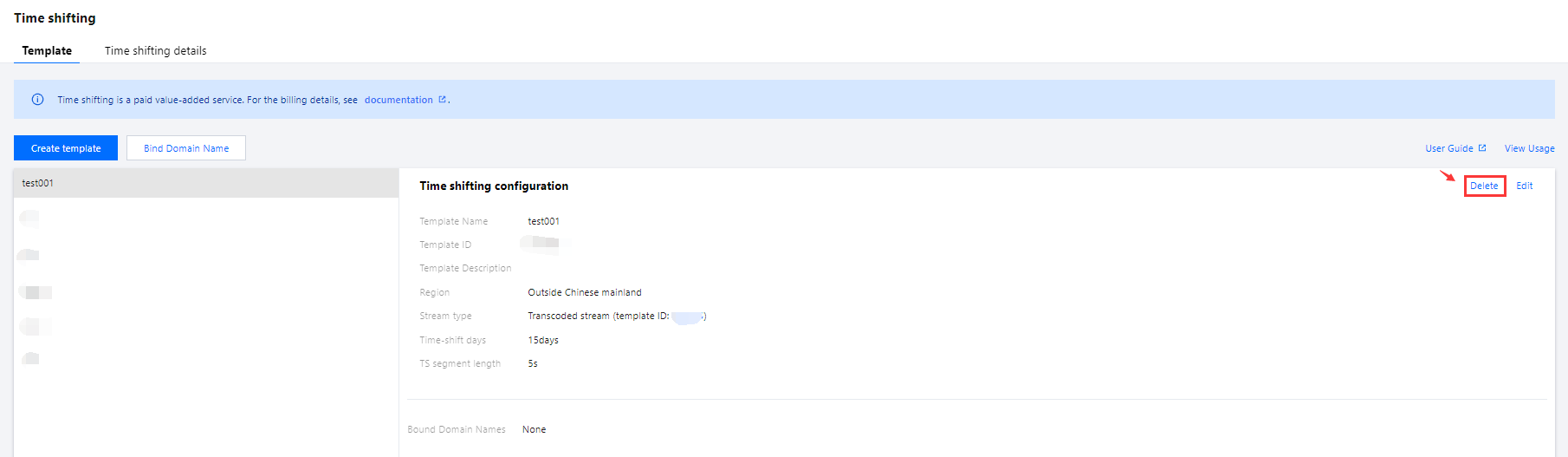 1. Log in to the CSS console, and select Feature Configuration > Time Shifting on the left sidebar. 2. Select the target time shifting template, and click Delete in the upper right.