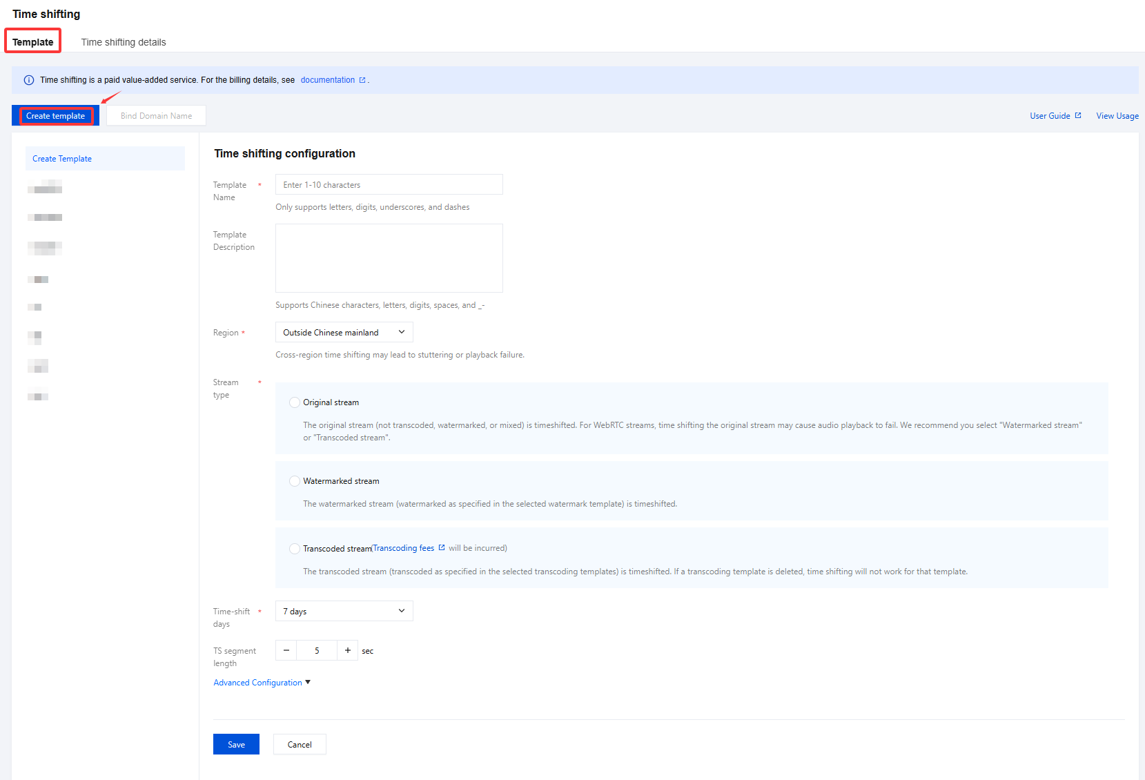 1. Log in to the CSS console and select Feature Configuration > Time Shifting on the left sidebar. 2. Click Create template to set the template information and configure the following settings: