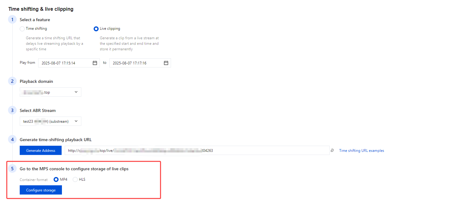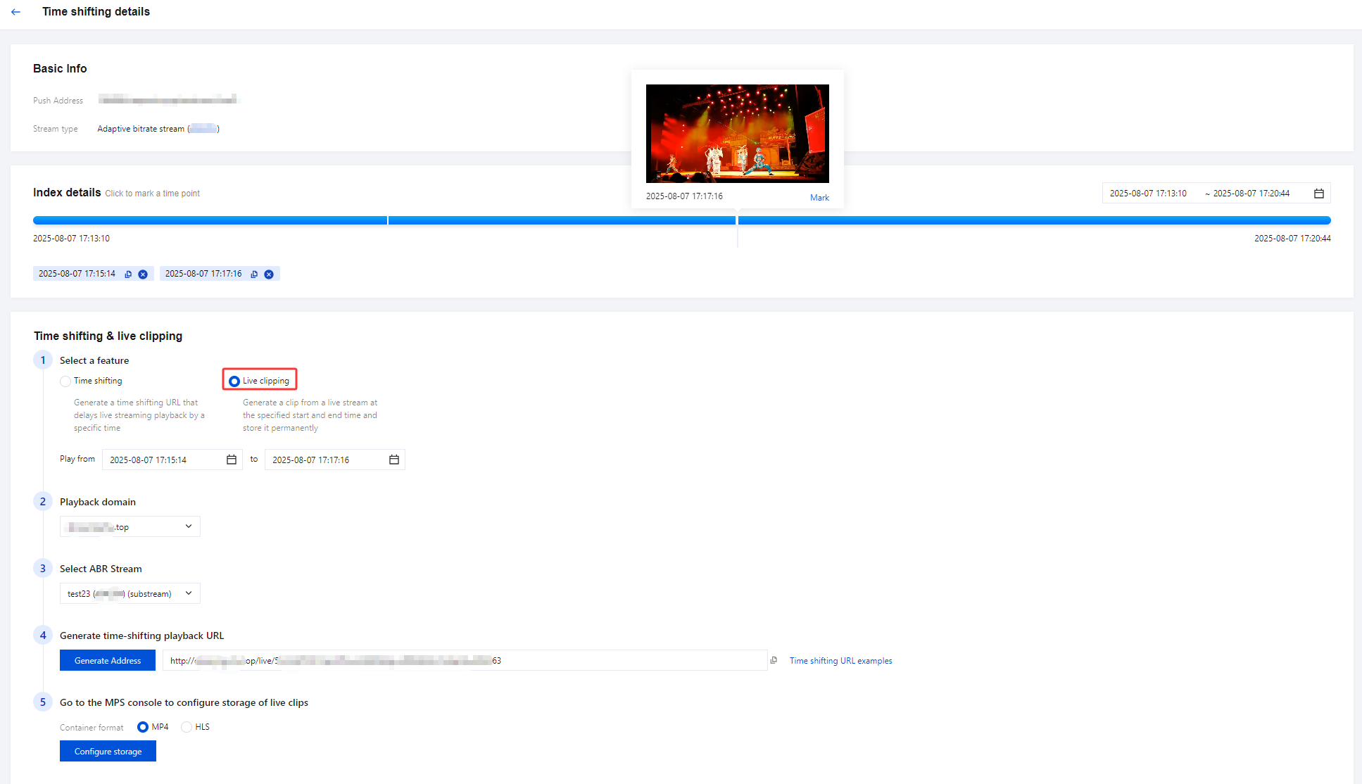 8. 生成时移播放地址:单击生成地址 ,即可生成时移播放地址,支持一键复制地址。