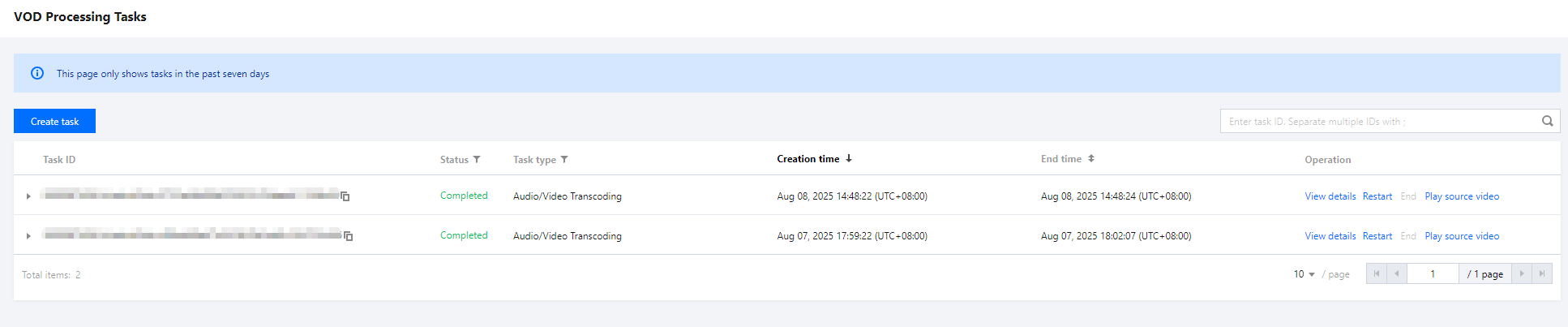 3. 选择输出路径,单击创建即可。详情请参考任务管理文档。 4. 当任务创建完成后,您可以查看视频剪辑任务的执行情况和结果。您可以进入 对象存储(COS)对应的目录,在该目录下,可查找剪辑固化的文件。通常,文件名称和路径会根据您在创建任务时设置的输出参数而定。 通过接口创建剪辑固化任务