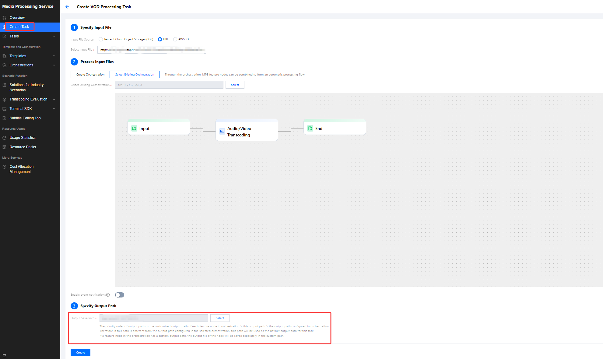 2. 当您单击时移固化,系统将自动跳转至媒体处理 >创建任务页面,在该页面中,系统将自动填充时移精彩剪辑地址和对应转封装服务编排模板,您可以根据业务需求对任务进行配置。