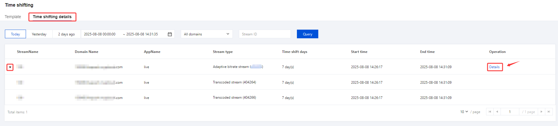 1. 使用已绑定时移模板的域名进行推流后,选择左侧菜单栏中的功能配置 > 直播时移 > 索引信息,进入索引信息页。 2. 选择需要剪辑的直播流,单击右侧的查看详情进入时移详情页面。
