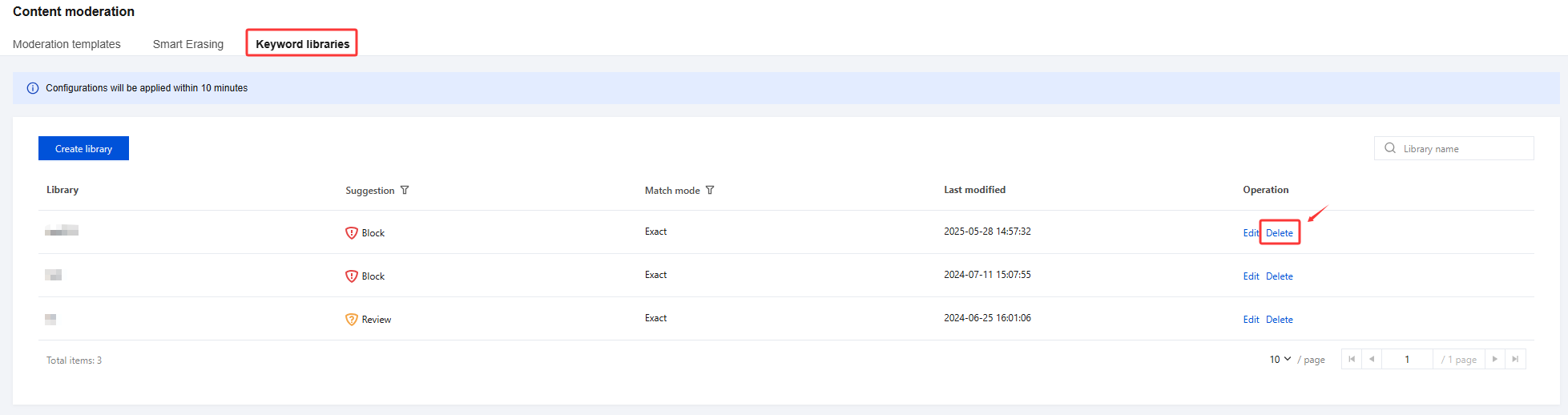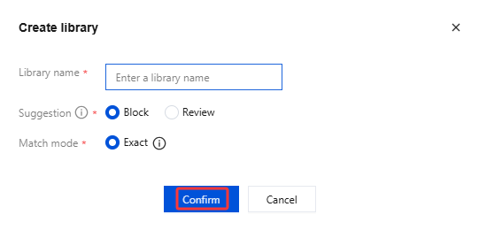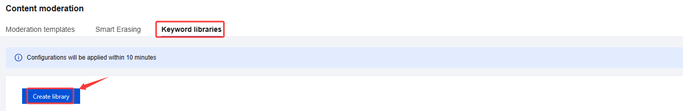 1. Log in to the CSS console and navigate to Feature Configuration > Content moderation > Keyword libraries. 2. Click Create library. In the pop-up window, fill in the configuration items based on your actual business requirements.