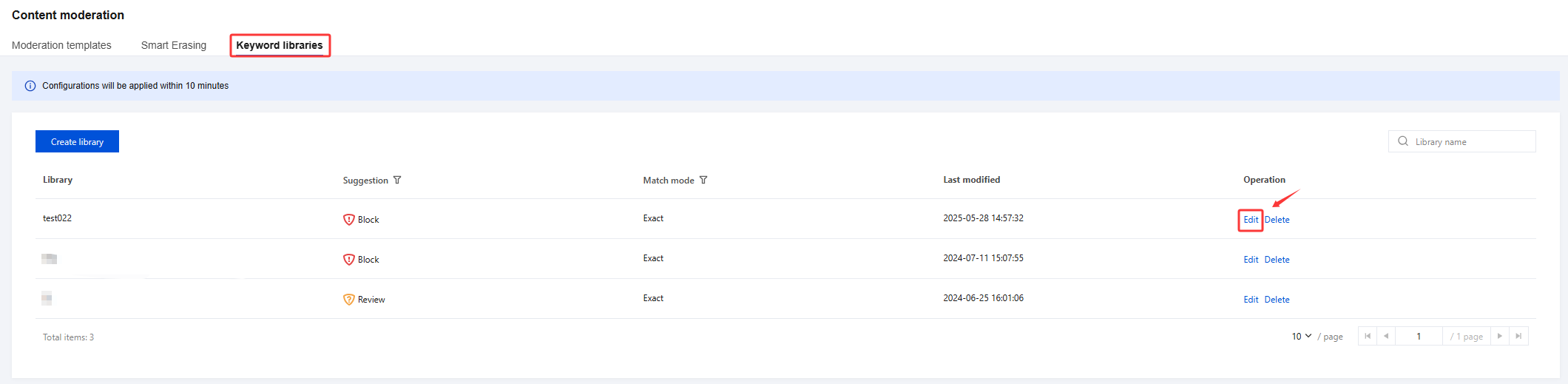 1. On the keyword libraries page, find the library you want to modify, click Edit on the right, and modify the configuration in the pop-up window on the right according to your business requirements.