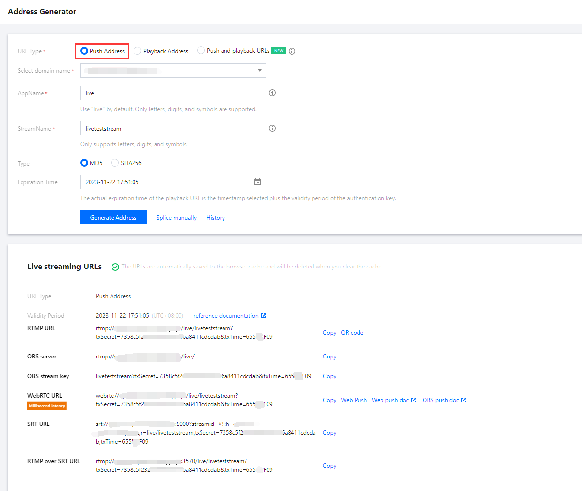 1. The generation of live streaming URLs can be carried out in the following two methods: