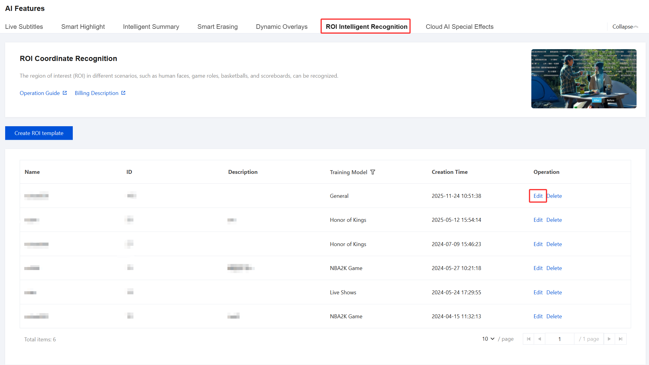 1. Log in to the CSS Console and navigate to AI Features > ROI Intelligent Recognition. 2. Select your successfully created ROI configuration template, and click Edit on the right to modify the template information.