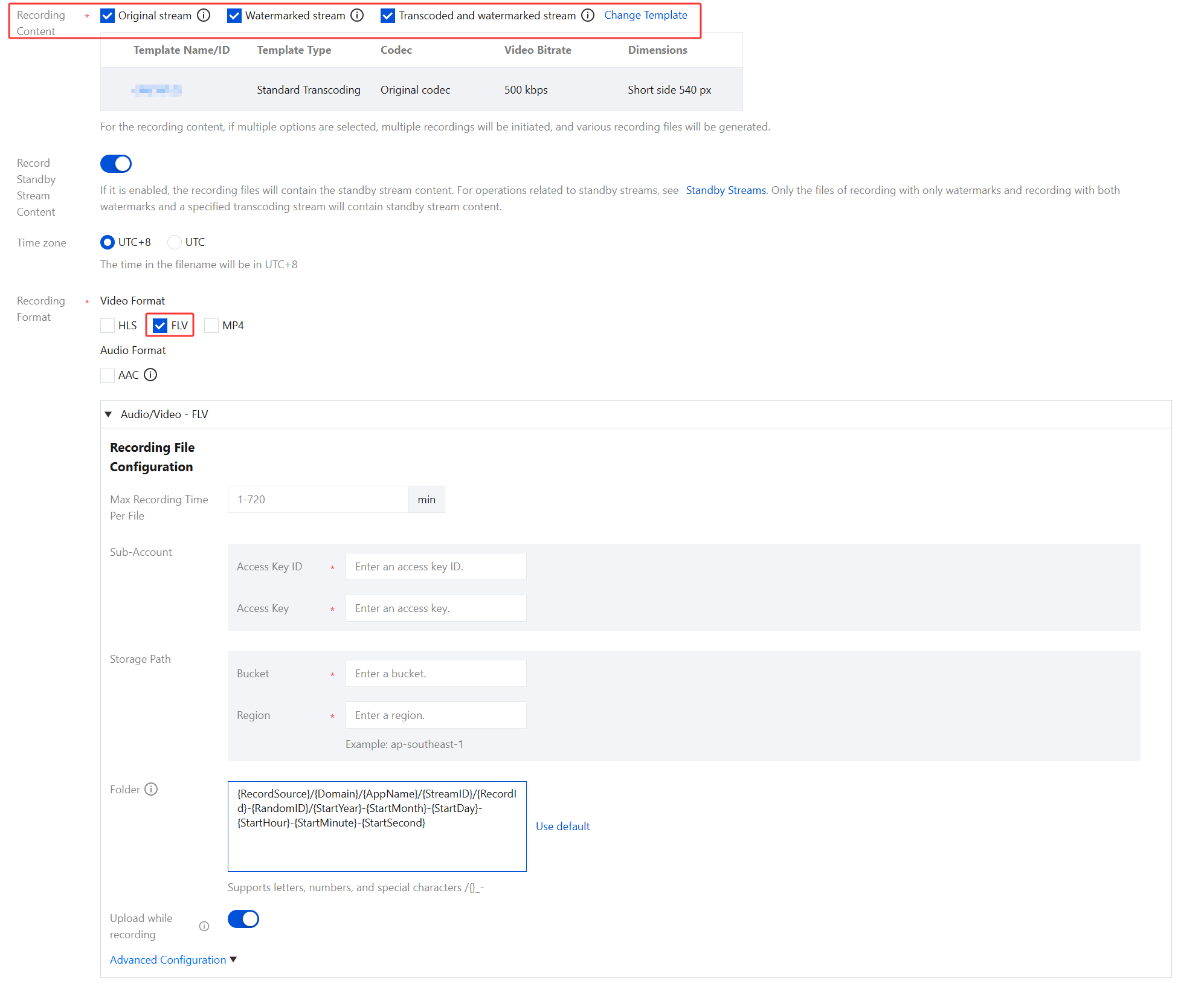 Upload while recording | The upload while recording feature is disabled by default. You can manually enable this feature based on your business needs. Currently, only the FLV format supports the upload while recording feature. Once enabled, it allows immediate upload of files after recording ends, supports a recording file duration of up to 12 hours, and enhances FLV recording's disaster recovery capability. Playback files may experience stutter when being dragged for online playback, but this does not affect local playback. |
