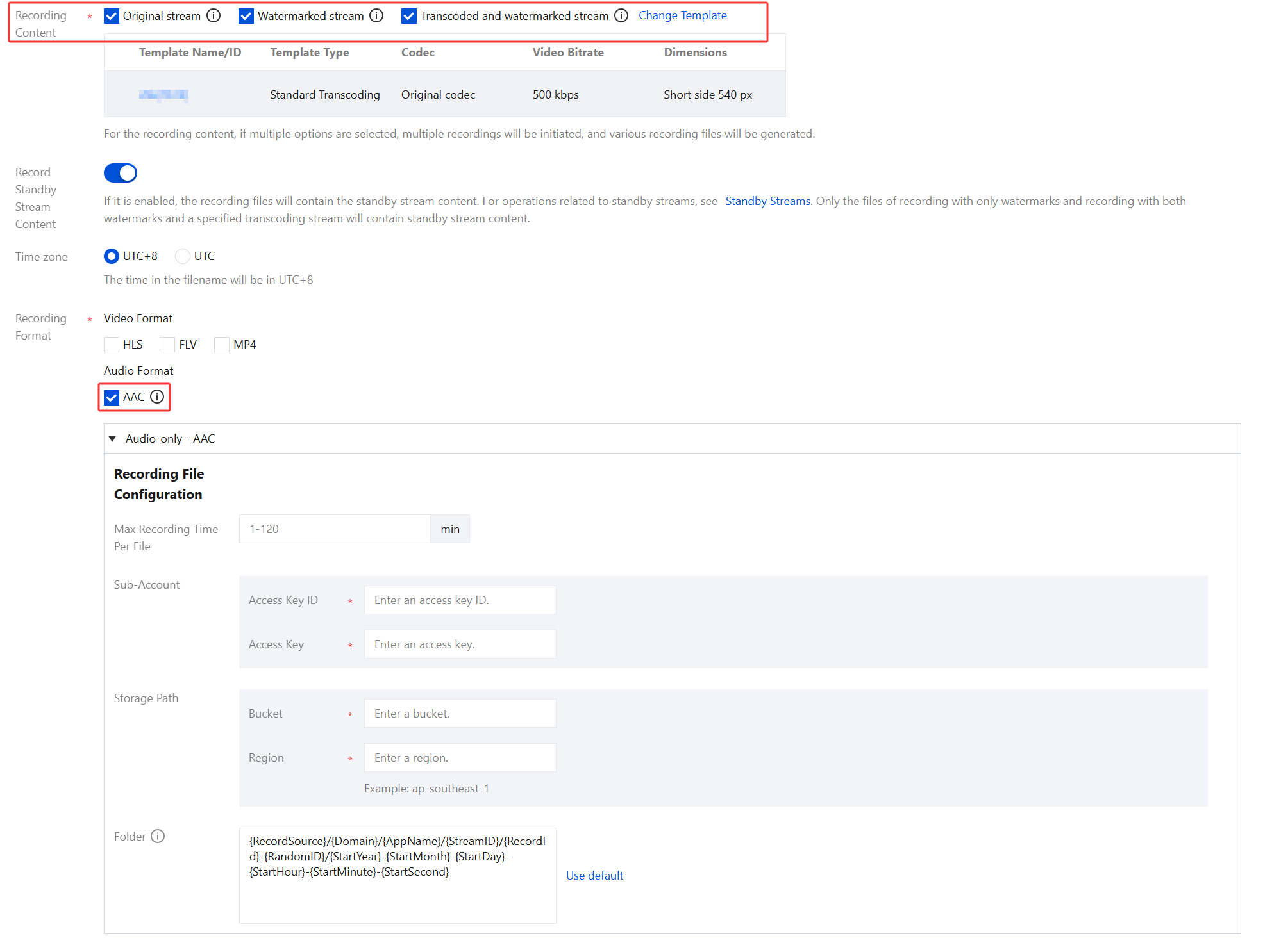 Recording Format | | Videos can be output in the formats of HLS, FLV, MP4, and AAC (for audio-only recording). |
