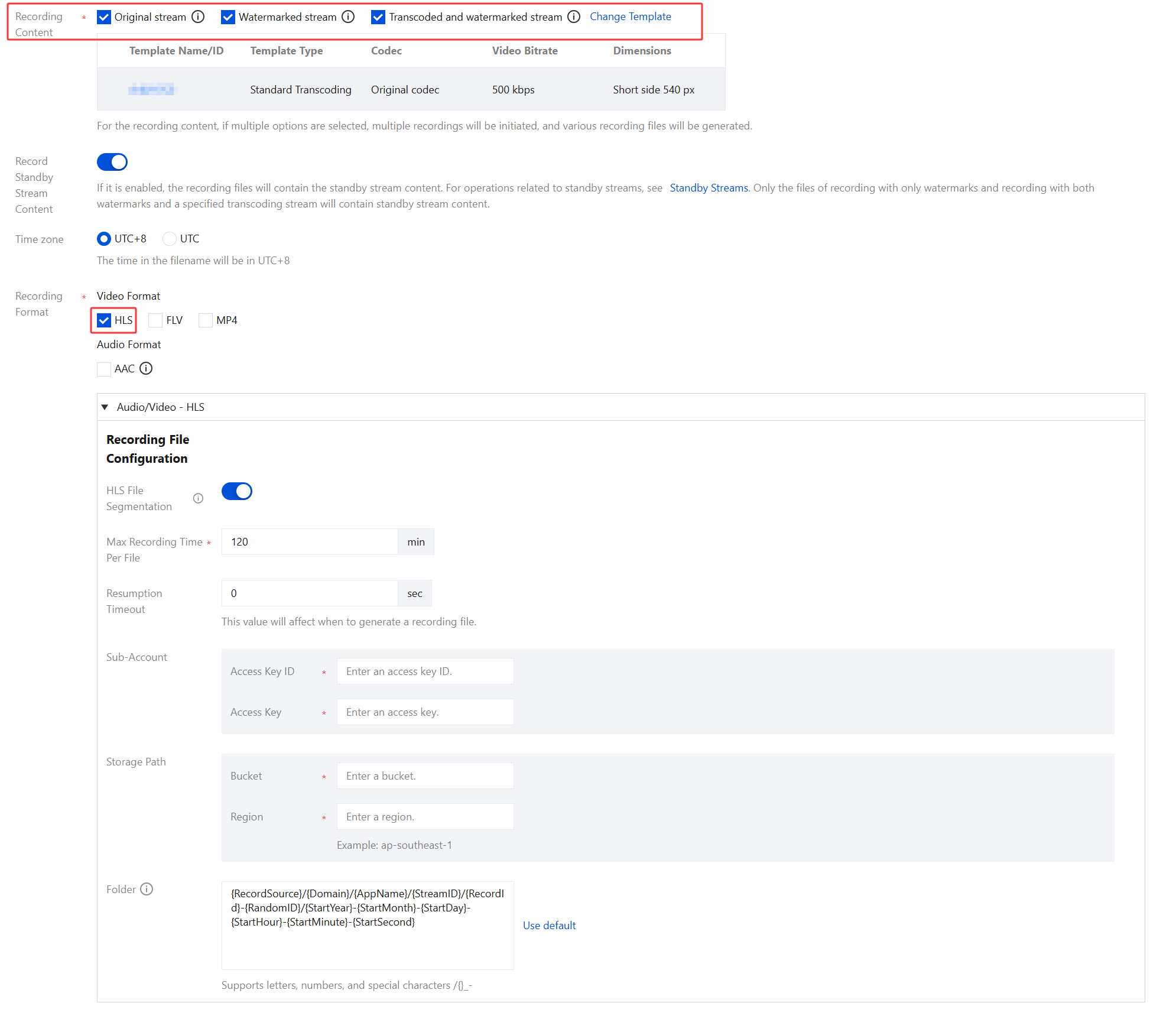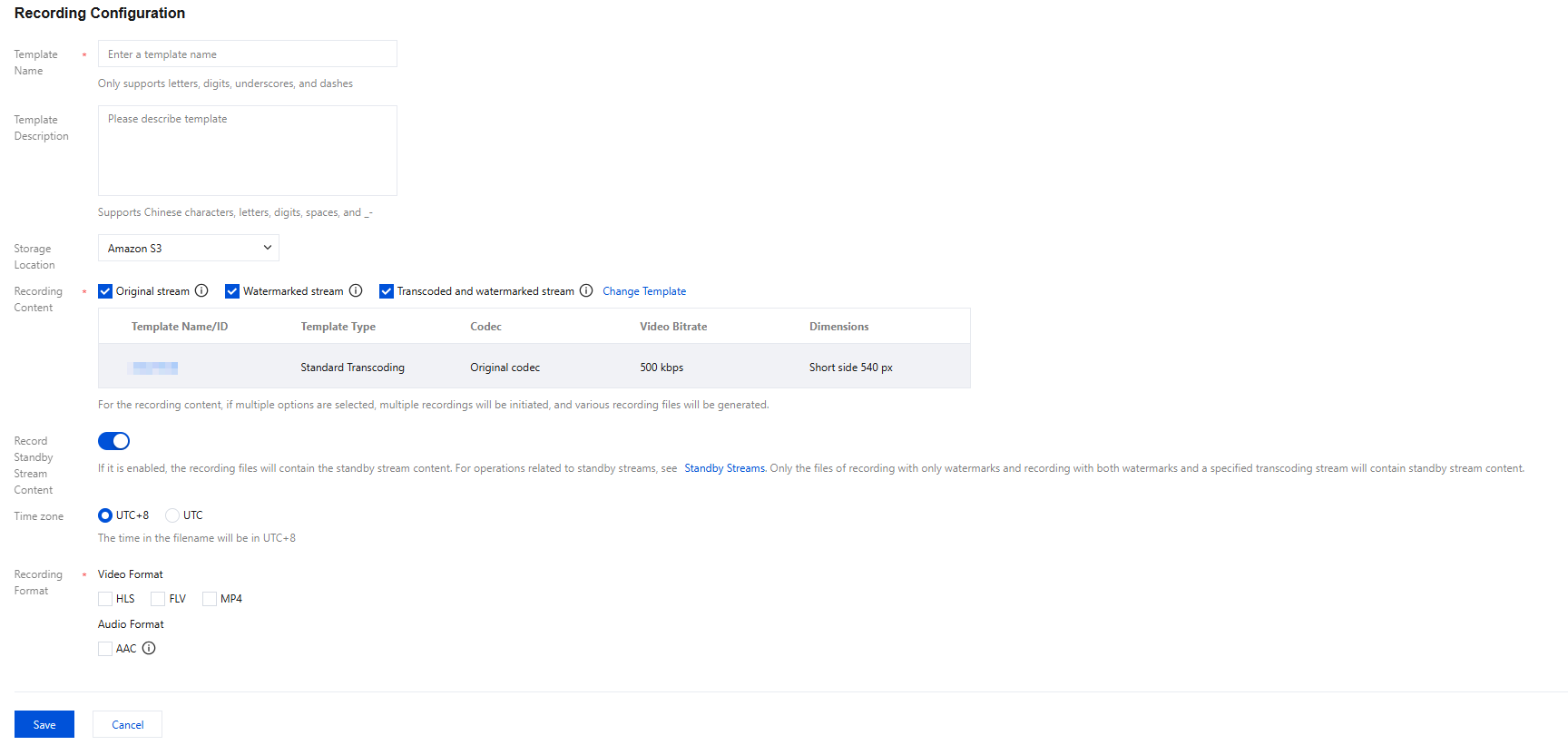 Template Name | | Live recording template name, customizable (only Chinese characters, English letters, digits, underscores (_), and hyphens (-) are supported). |