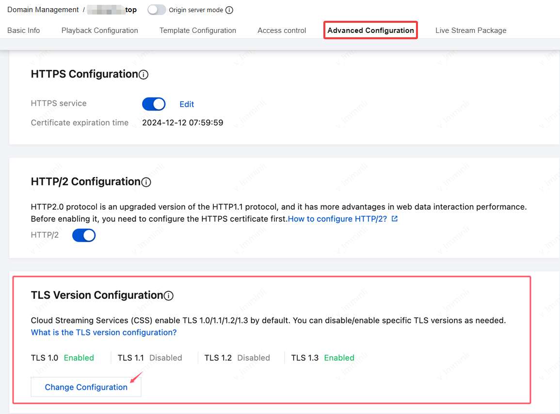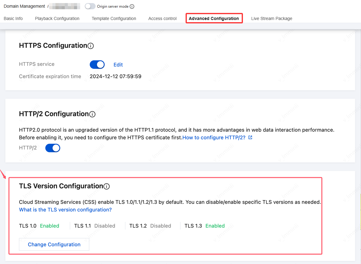 1. Enter Domain Management, and click the playback domain you want to configure or Manage on the right to enter the domain detail page. 2. Switch to Advanced Configuration and find TLS Version Configuration.